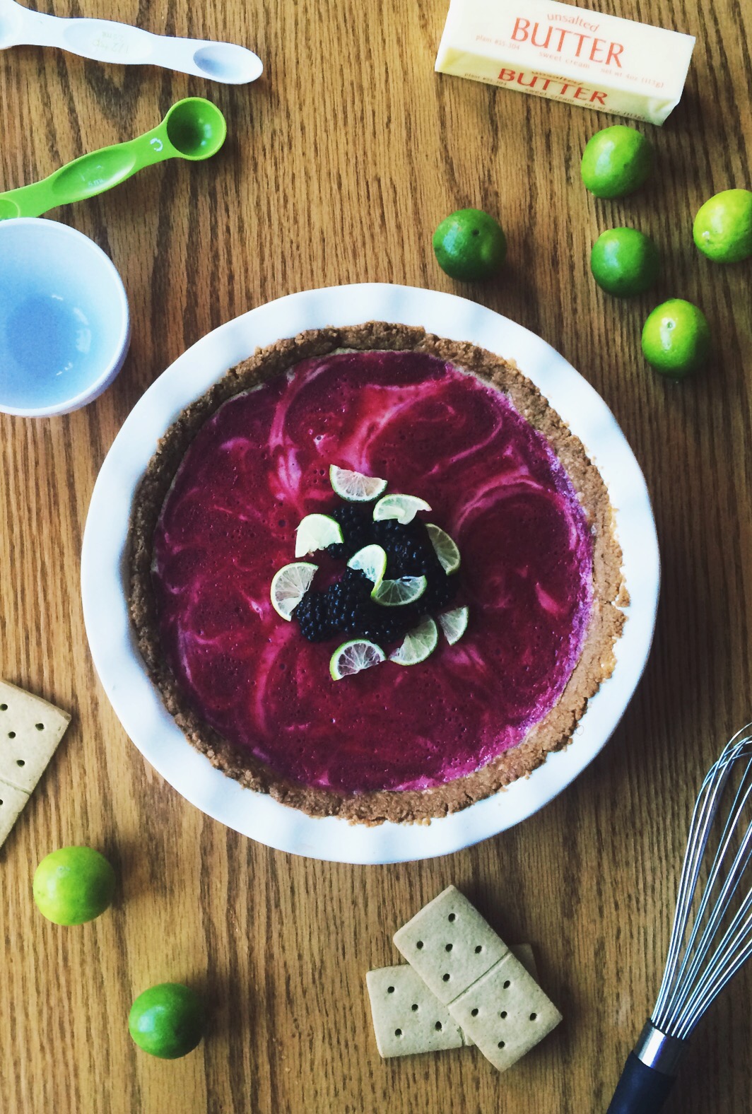 Which is how I found myself baking key lime pie for the second time this week. As the adventurous human I am, I added a blackberry swirl mostly because—how pretty is a pink pie? Lime in love.